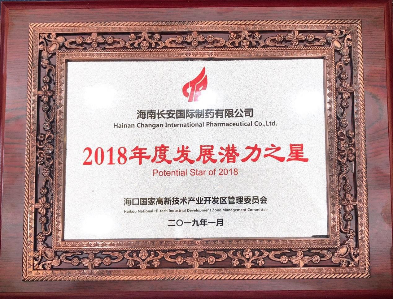 大會對科技進度與提質增效這兩方面表現突出的企業進行表彰,海南長安國際制藥有限公司榮獲“2018年工業發展十強”“2018年發展潛力之星”、、“2018年醫藥單品種銷售收入六強”稱號。